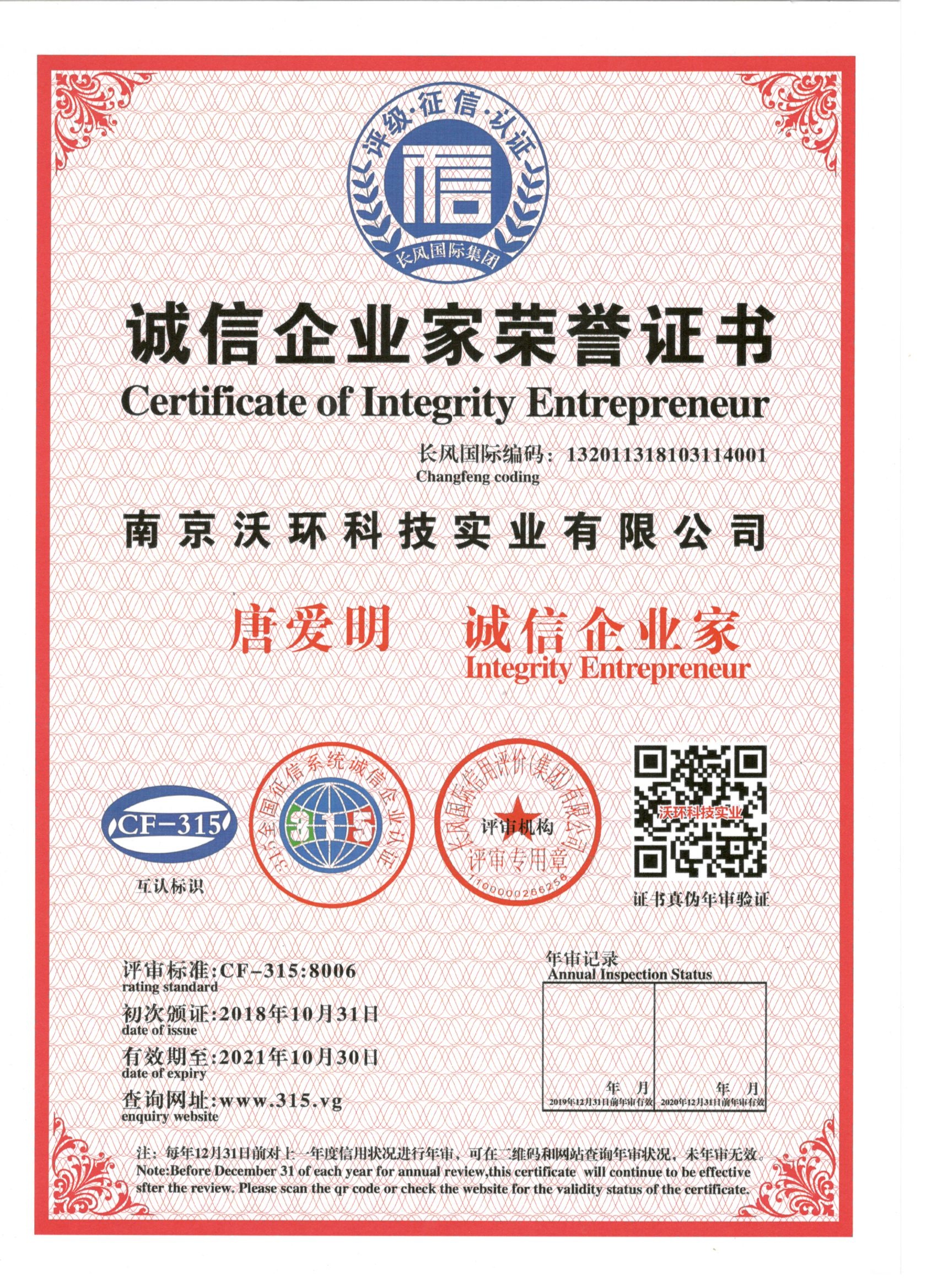 熱烈祝賀南京沃環(huán)公司唐愛(ài)明先生被專(zhuān)業(yè)評審機構-長(cháng)風(fēng)國際集團評為誠信企業(yè)家,特發(fā)此證書(shū)
