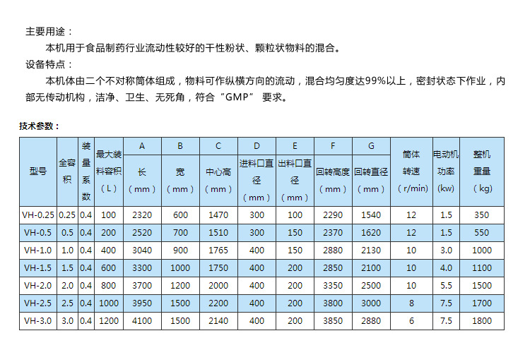 產(chǎn)品概述: 本機適用于制藥、化工、食品的干粉狀、顆粒裝物料的混合。該機混料筒結構獨特,混合均勻,效率高,不積料。整機結構簡(jiǎn)單,操作容易。外表面和物料接觸部分均采用優(yōu)質(zhì)不銹鋼制造,造型美觀(guān),維護、清洗方便。 應用場(chǎng)景: 本機用于制藥及其它行業(yè)的粉狀或粒狀物料混合之用。本系列混合機有高效混合型和普通混合型兩種,高效型混合機主要對較細的粉;驅δ骋恢髁虾枯^少的物料均能混合均勻;普通型混合機主要適用于一般物料或產(chǎn)量較大的企業(yè)使用。筒體光滑無(wú)死角、整機采用不銹鋼材料制作、且外型美觀(guān)等特點(diǎn)。 工作原理: 本機一端裝有電機與減速機,電機功率通過(guò)皮帶傳給減速機,減速機再通過(guò)聯(lián)國器傳給V型桶。使V型桶連續運轉,帶動(dòng)桶內物料在桶內上、下、左、右進(jìn)行混合。 材質(zhì)及結構: 1、 混合機的筒體采用2.5mm304-2B不銹鋼材料制作,外包采用1.2mm304-2B的不銹鋼材料制作,支架采用5#槽鋼。 2、混合的出料閥選用全不銹鋼精加工而成,并在連接處采用定型硅橡膠材料密封,確保機器在工作時(shí)的密封效果。 3、混合機的進(jìn)料口采用選進(jìn)的快開(kāi)結構,使用戶(hù)在進(jìn)料和清洗時(shí)操作簡(jiǎn)便。 4、混合機筒體兩側拼縫處加焊兩塊不銹鋼引板并采用拋光處理,使筒體內無(wú)一處死角,確;旌蠙C在混合、清洗時(shí)能夠達到理想的效果。 5、混合機內設有強制攪拌裝置。